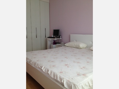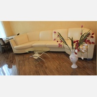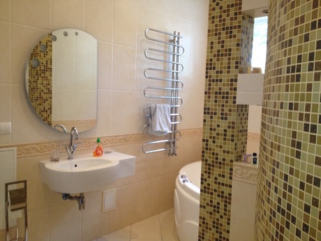 Кухня-студия оборудована всей современной мебелью и техникой: светлая кожаная мягкая мебель, стеклянный столик, аудио- и видеоаппаратура. В гостевой комнате 2х спальная кровать,в спальне – широкая кровать с ортопедическим матрацем и вместительная гардеробная. Ванная комната выложена мозаикой, с современным джакузи. В коридоре встроенный шкаф. Подъезд чистый, подключен домофон.