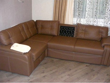 Мебель современная - угловой диван, встроенная кухня, шкаф-купе в прихожей.